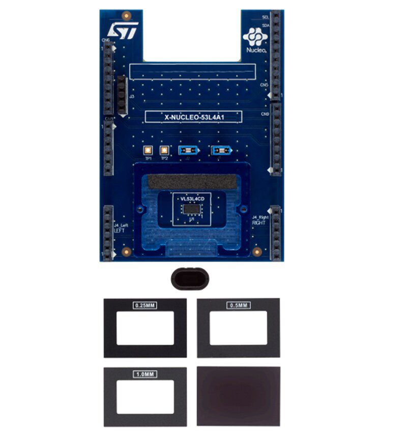 The STM X-NUCLEO-53L4A1 Expansion Board provides a cover glass holder that fits three different spacers of 0.25mm, 0.5mm, and 1mm height below the cover glass to simulate various air gaps. Additionally, a small oval cover glass fitting the sensor is incorporated.